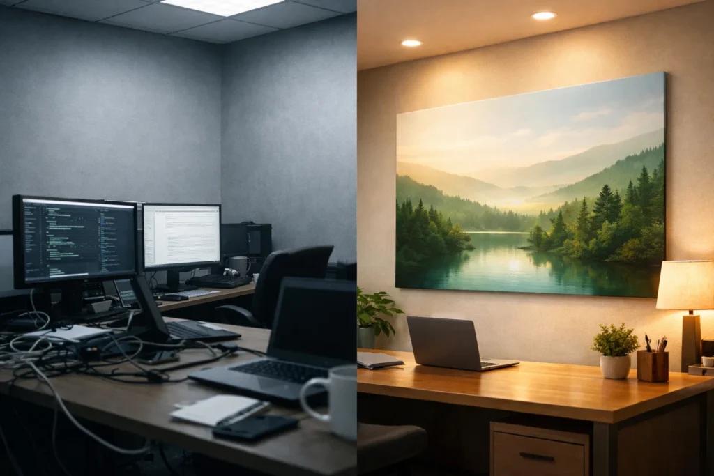 Office wall decor is not therapy, but visual choices can influence how a room feels. Nature themes tend to be easier on the eyes than busy patterns, and they can soften areas that are mostly screens and hard edges. If your goal is a calmer atmosphere, focus on artwork that feels open, balanced, and not overly complex.